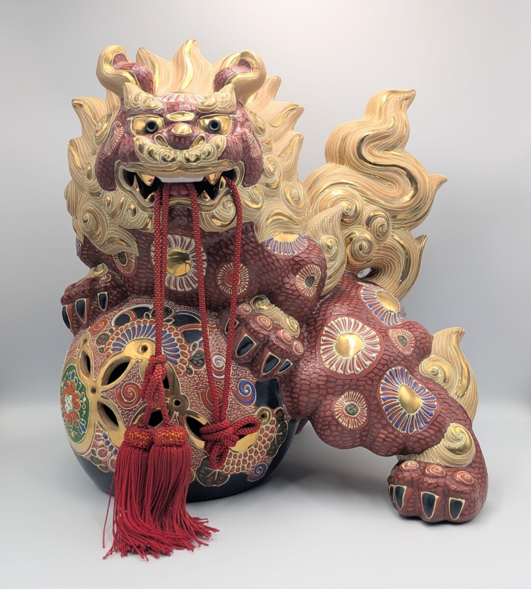 > 九谷焼 骨董 民芸品 宝獅子 魔除け獅子 縁起物 獅子 狛犬 置物 玉乗り獅子 シーサー 赤獅子