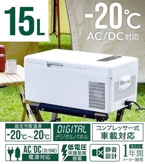- 車載 冷蔵庫 冷凍庫 15L ホワイト DC 12V 24V AC 2電源 ポータブル冷蔵庫 自動車 トラック 冷蔵 冷凍 保冷 小型 車 アウトドア キャンプ