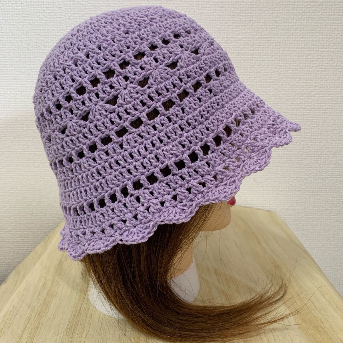 - 【a90】コットン100% レース編み フリル ラベンダー バケットハット 帽子