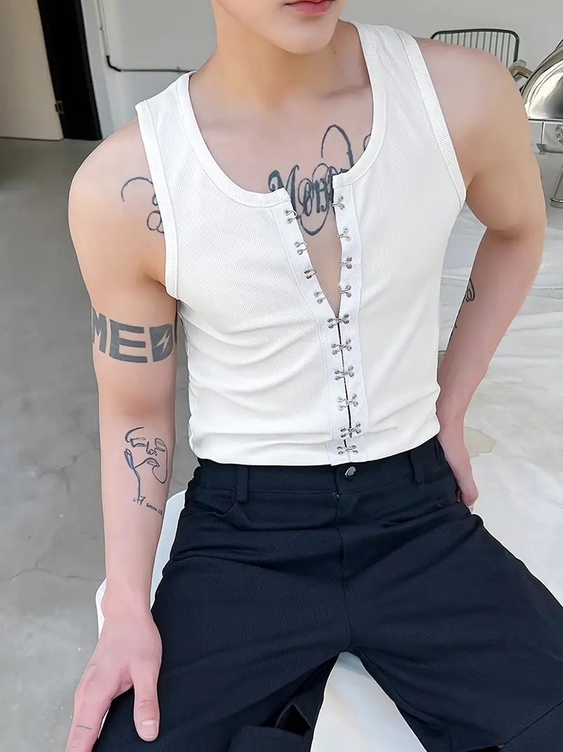 - メンズスリムフィットストレッチタンクトップセンターのボタンがアクセントだしsexyです他にないデザインなのでオススメ人気です是非この夏