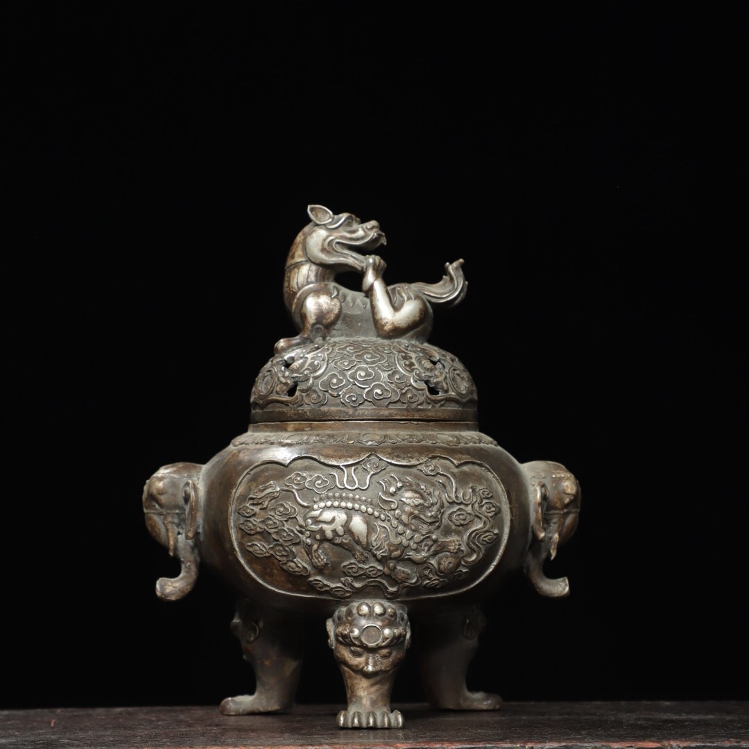 - 蔵友旧蔵出 銅製 銀鍍 麒麟紋 雙象耳三獣足熏香爐 置物 古賞物 中国古玩 中国古美術品