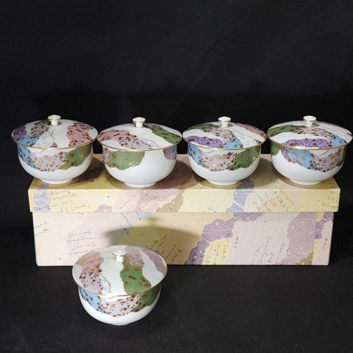 - ちぎり絵 蓋付湯呑揃 5客 未使用箱入 /湯飲み/和食器/陶磁器/