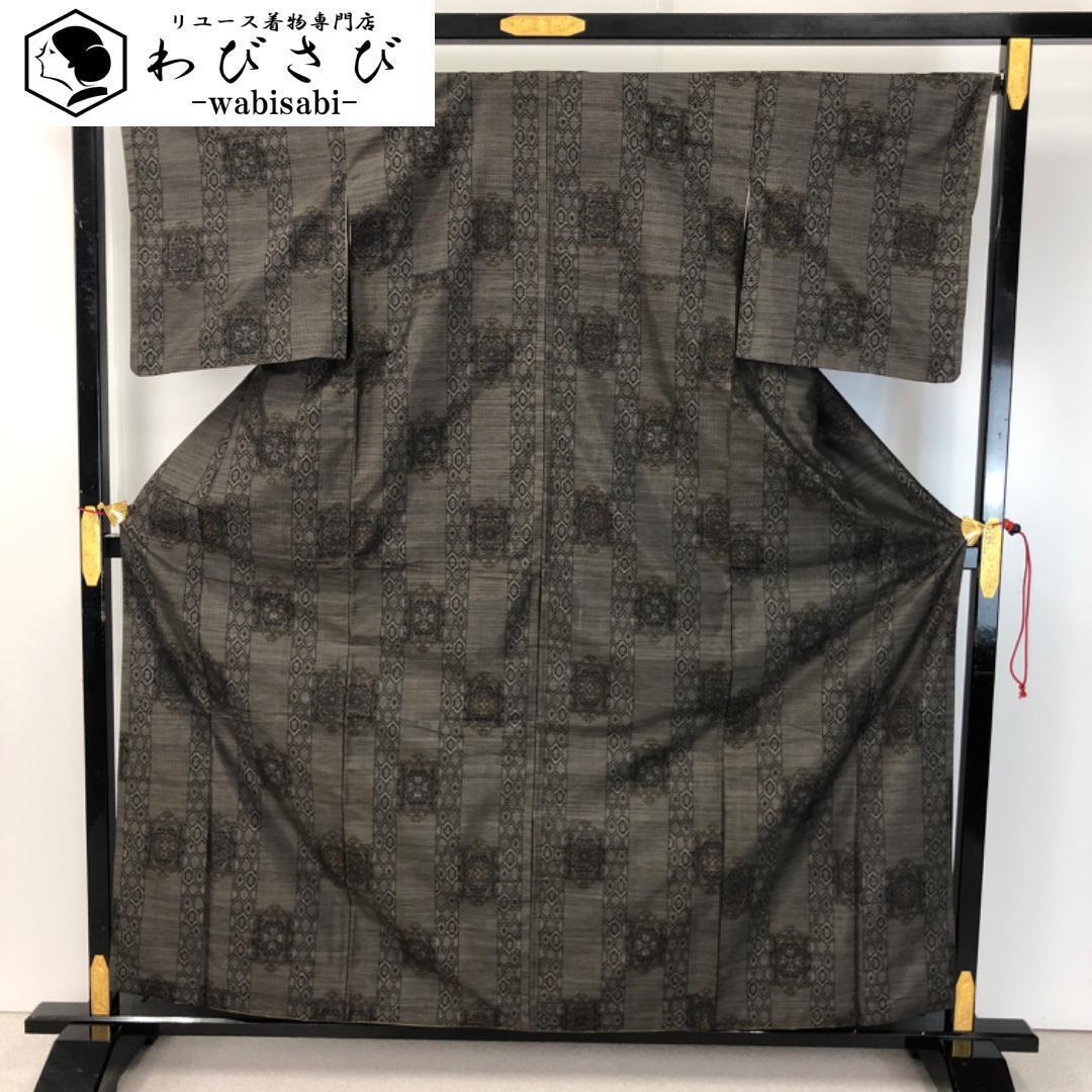 > 本場大島紬 横双絣 茶泥染 阿多利 縦縞に華柄模様 K-4706 着物 きもの kimono 和服 和装 中古 リサイクル着物 【送料無料】