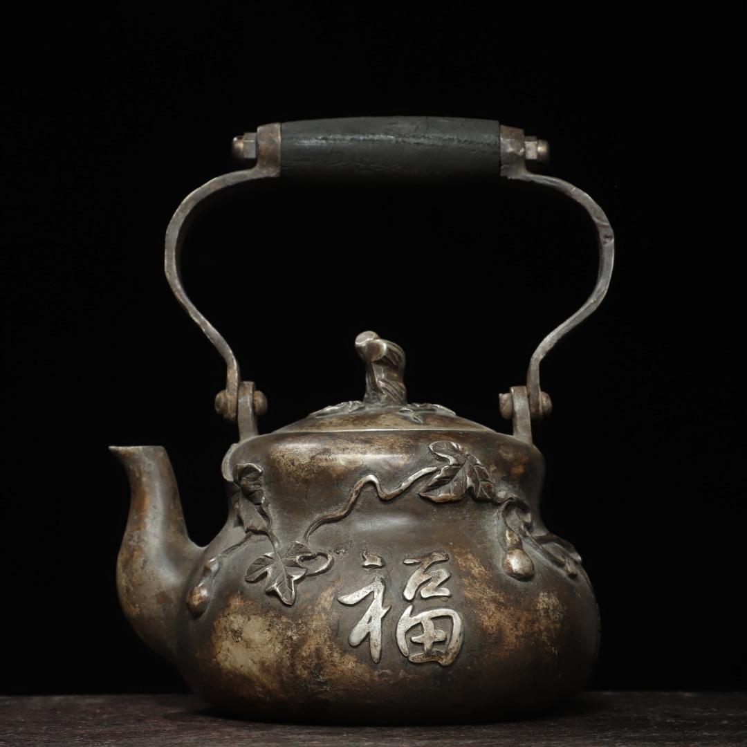 - 民国時期 民国三年 古銅塗銀 福寿葫芦紋 提梁壺 急須 煎茶道具 極細工 置物擺件 古美術品 時代物 古賞物 古董品 収集 旧家蔵出 中国唐物