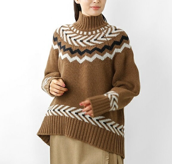 > CINOH/チノ/メリノウールセントゥリペタルパターン/オーバーサイズハイネックニット/ブラウン/ゆったりシルエット/裾前後差デザイン