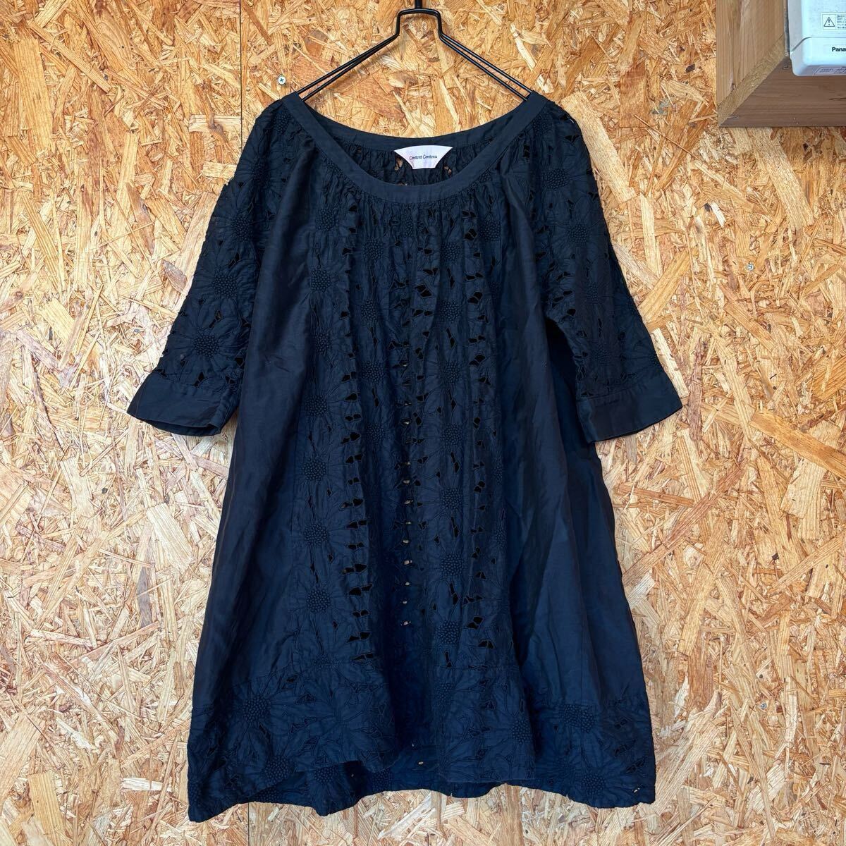 - 美品 content contenu ひざ丈ワンピース 向日葵 刺繍 レディース ワンピース 半袖ワンピース ブラック シルク混 トップス 4375