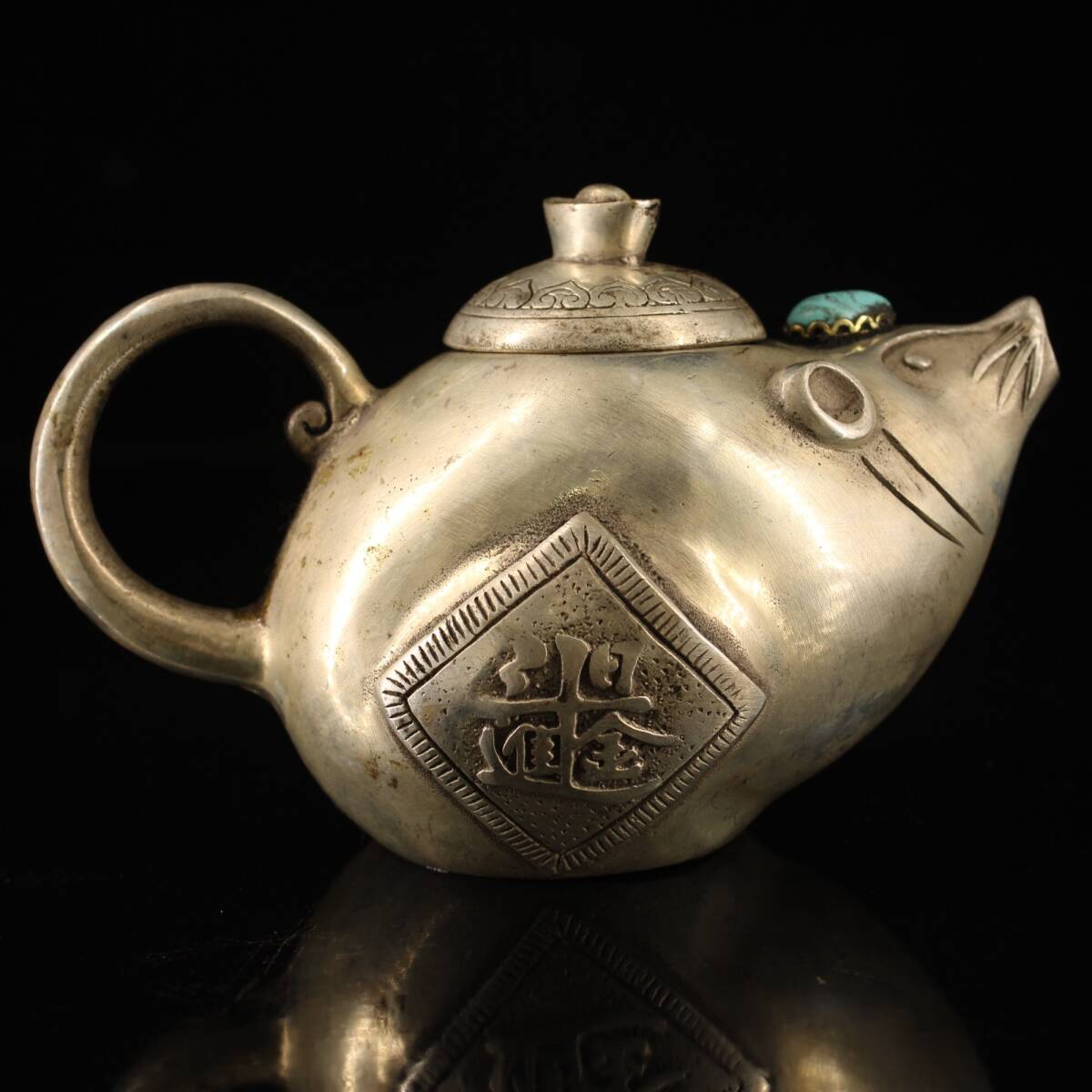 - 『館蔵珍品 銅製 銀鍍 寶石嵌 端把老鼠酒壺』置物 賞物 貴重物品 収蔵品 中国古美術