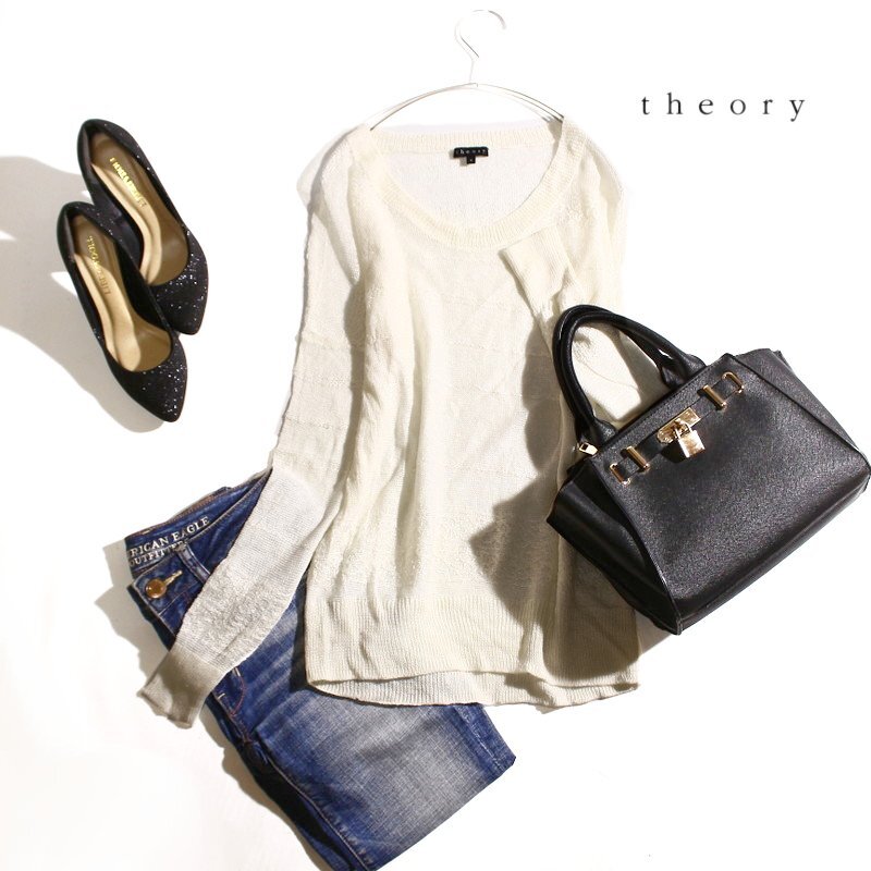 > 美品 セオリー Theory 春 夏 透け リネン 麻75% デザイン ボーダー 柄 丸首 サマーニットカットソー S ホワイト 白 ニットセーター ミセス