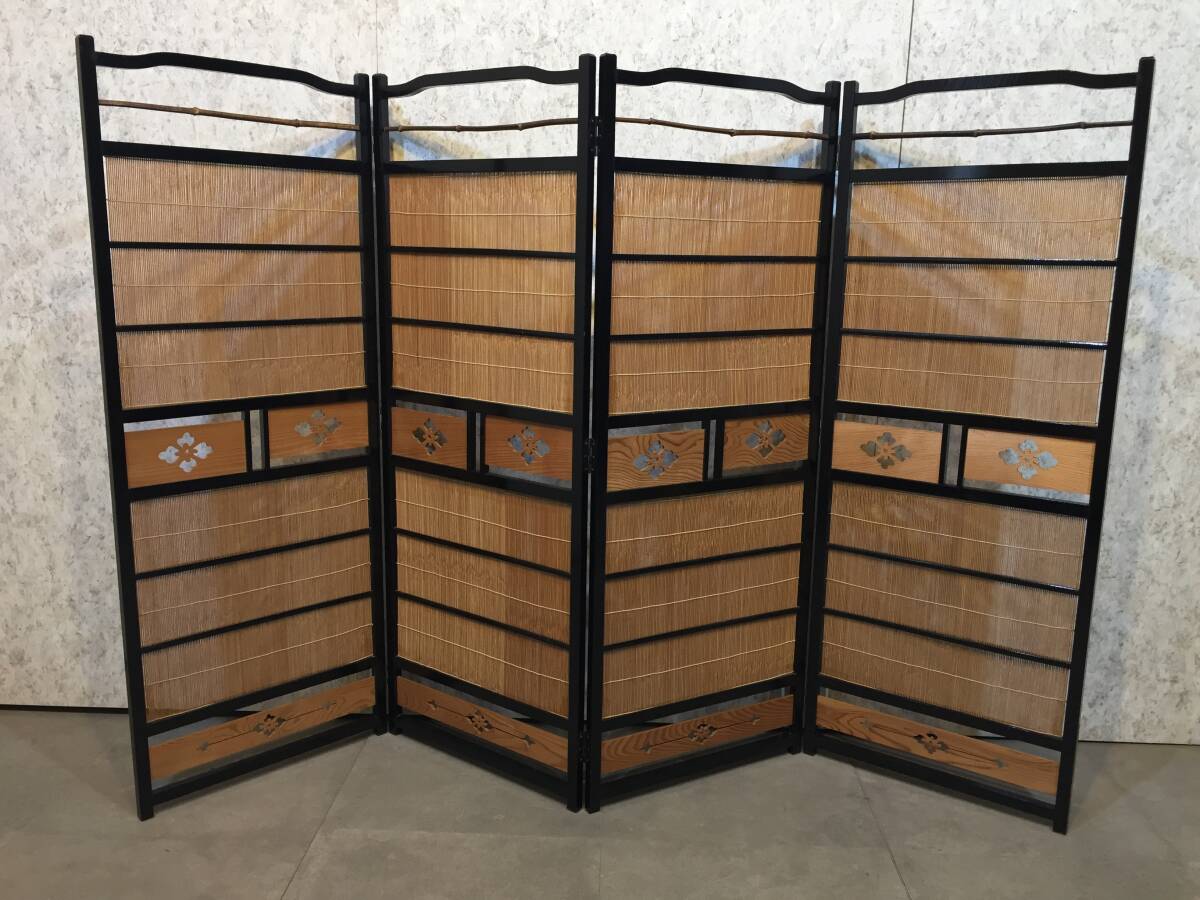 - 『 漆塗り衝立 』B2 4連 細竹編み衝立 衝立 風先屏風 間仕切り 建具 和家具 レトロ インテリア用 パーティション 古民家 ★古時家★