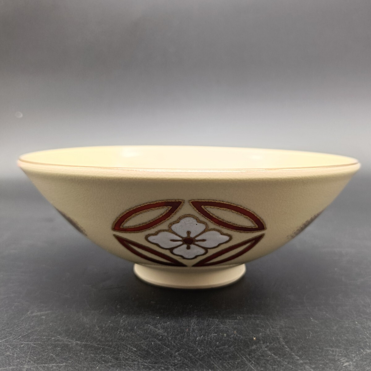 - 龍靖 色絵 京焼 仁清写し 七宝柄 平茶碗 茶碗 抹茶碗 茶道具 茶器 イ18-6