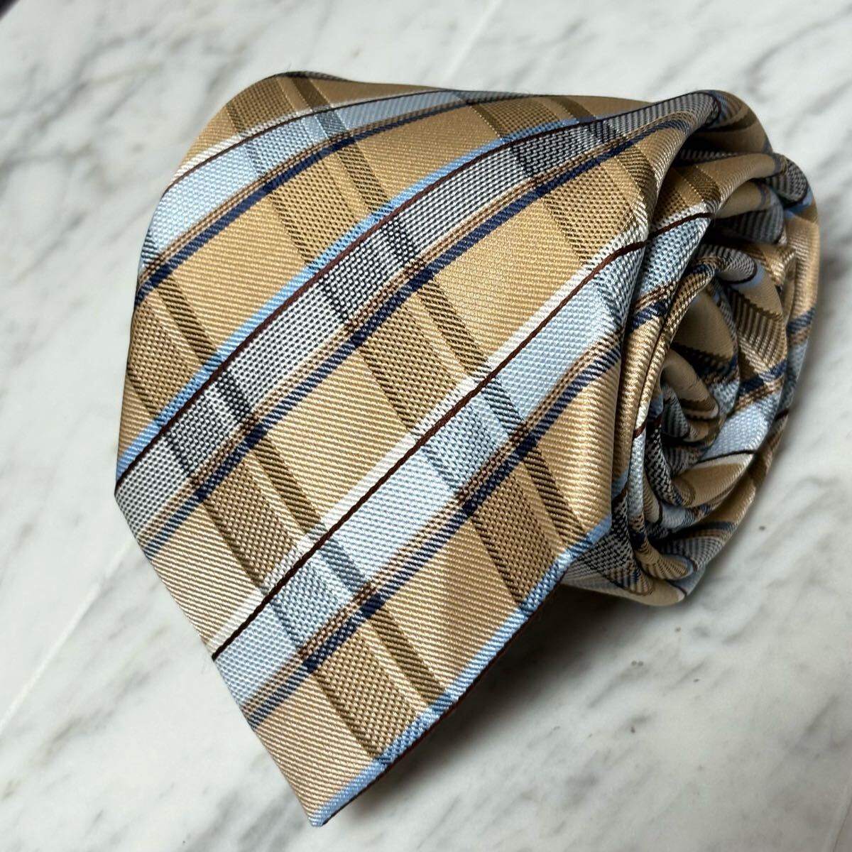 - 【美品】 999円~ renoma ネクタイ チェック柄 ベージュ ブルー系 (YW3)