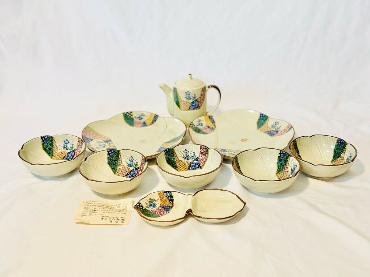 > 未使用 萬宝窯 加賀友禅 中皿 小鉢セット 梅型 薬味皿 天ぷら皿 セット 天つゆポット 陶器 和食器 9点セット