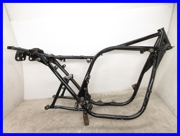 ハンドルストッパーに曲がりあり。フレームに目視で曲がりなし。色塗りあり。 前面の補強板に少し歪みあり。右リフレクターステー切除加工あり。 左右ウインカーステーに少し曲がりあり。 左右リアサス取付部に少しネジ山潰れあり。 リアブレーキステーのアーム部分に少し曲がりあり。 右マフラーステーの下パイプにへこみあり。 マフラーステーの内側に削り加工あり。 バッテリーケースは車種違い。バッテリーケース取付部のステーを他社から移植あり。汚れあり。要清掃。