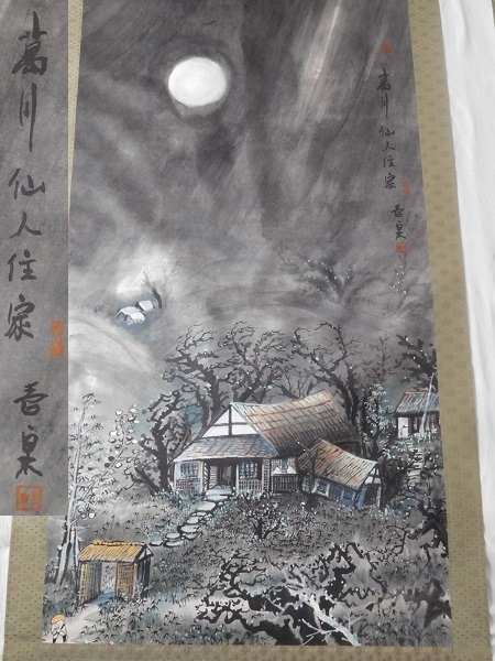 - 【模写】掛け軸 月下山村風景図 夜 月夜 葛川仙人住家 春泉銘?作者不明 紙本肉筆 人が描いたもの 幅広 合箱
