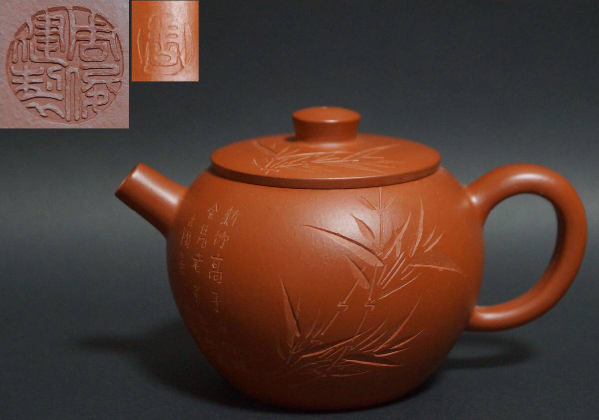 > 【閑】中国宣興紫砂 周健偉造 紫砂細工急須 刻『竹漢詩文』紫砂壺 鉄砲口朱泥 煎茶道具★時代物★7D0522
