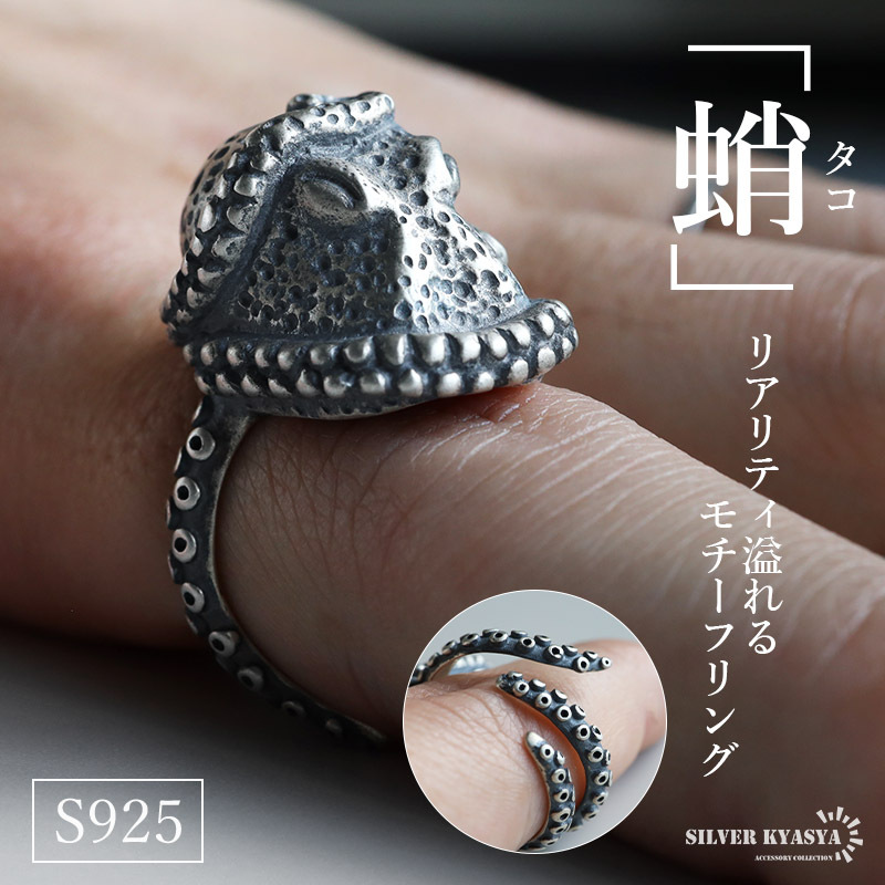 - シルバー925 タコリング 蛸 アニマルリング ユニークリング シルバーリング オクトパス 燻し 指輪 メンズ 男性 金アレ対応
