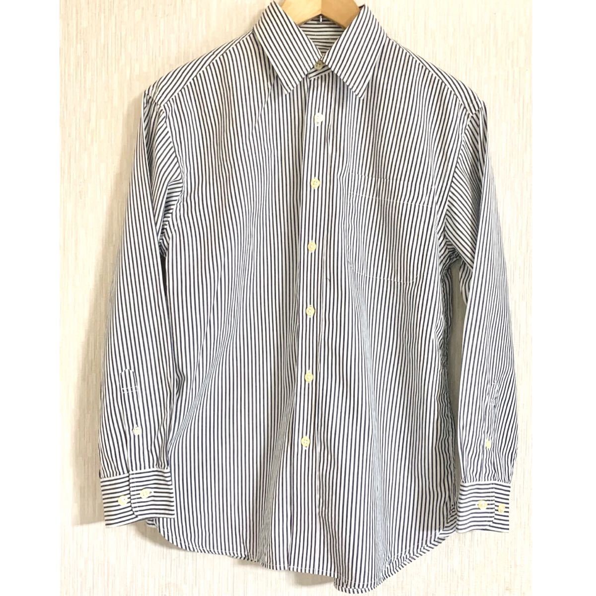 - ホワイト×ネイビー綿ストライプ コットン長袖シャツ 白紺長袖ブラウス トップス