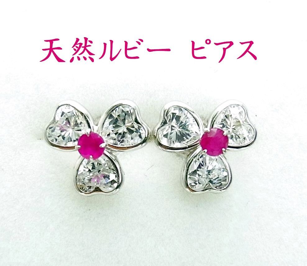 - 天然ルビー キュービックジルコニア クローバー型 14金ホワイトピアス 卸価格 商品動画あり 送料込み