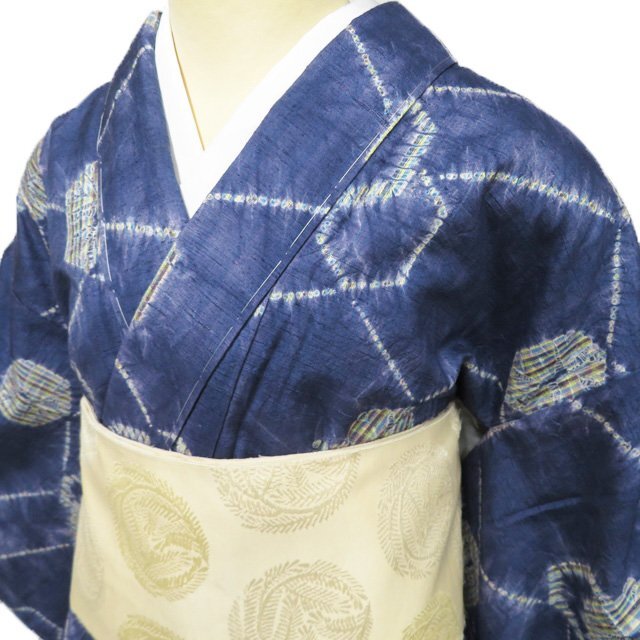 > 紬地 小紋 着物 未使用 正絹 袷 カジュアル 絞り染め 幾何学模様 青系色 多色 身丈155cm 裄64cm SA きもの北條 A1195-7