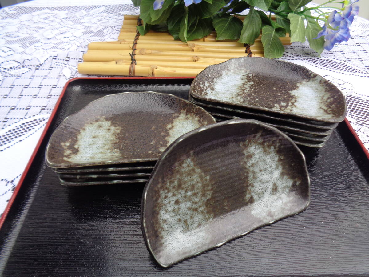 - 厨房用品 和風陶器 半月型皿 刺身皿/一品料理/焼き鳥 黒地×グレーまだら模様 10客 中古品