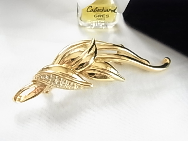 > ■ビンテージ/ヴィンテージ ゴールドトーン 金色トーンにクリアラインストーンが煌く リーフデザイン 葉のモチーフの素敵なブローチ