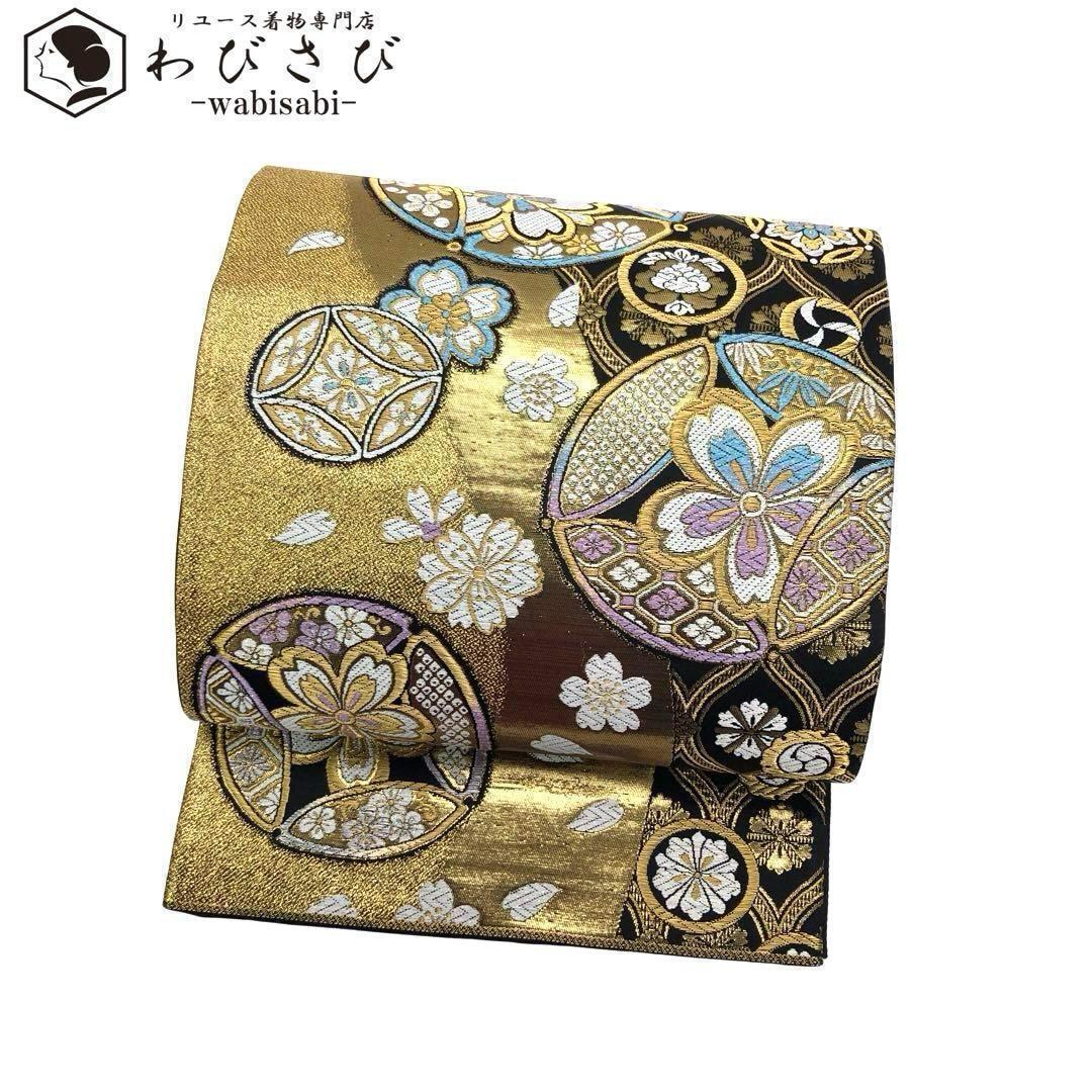 - 袋帯 煌びやかな桜の花模様 花七宝 黒金 金銀糸 振袖 O-3250 着物 きもの kimono 和服 和装 中古 リサイクル着物 【送料無料】