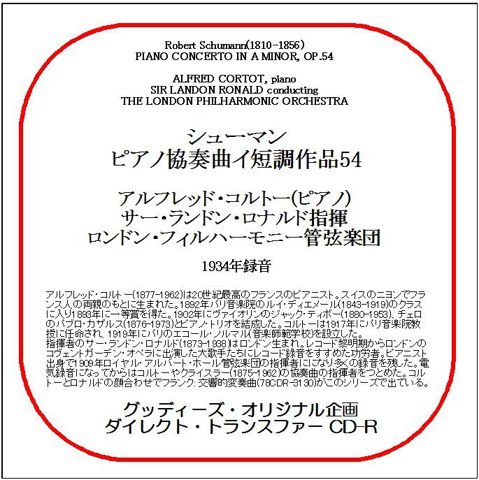 - シューマン:ピアノ協奏曲/アルフレッド・コルトー/ダイレクト・トランスファー CD-R