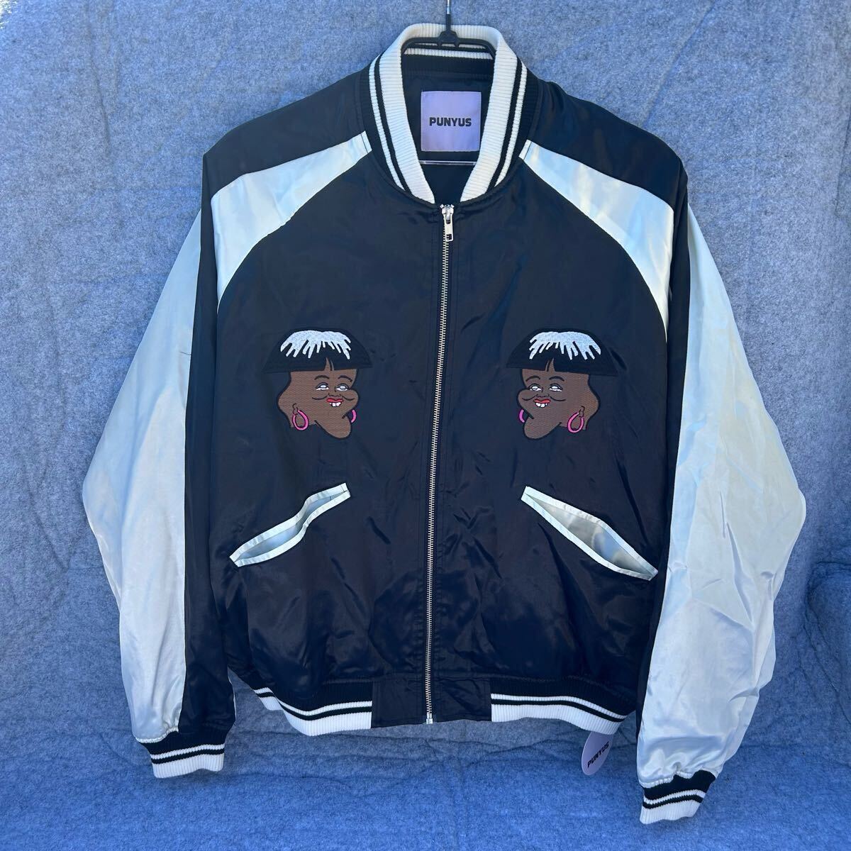 - PUNYUS プニュズ スカジャン サテン生地 刺繍入り 横須賀ジャンバー ジャケット ブルゾン ブラック サイズ4 渡辺直美 原宿系 大きいサイズ