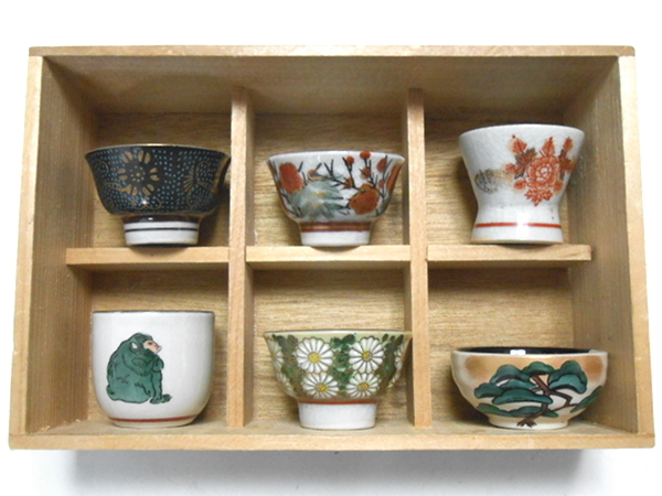 - 九谷焼★秀幸 仙守 祥隆等 盃 青粒・花唐草文様 猿文様 松文様等 6種