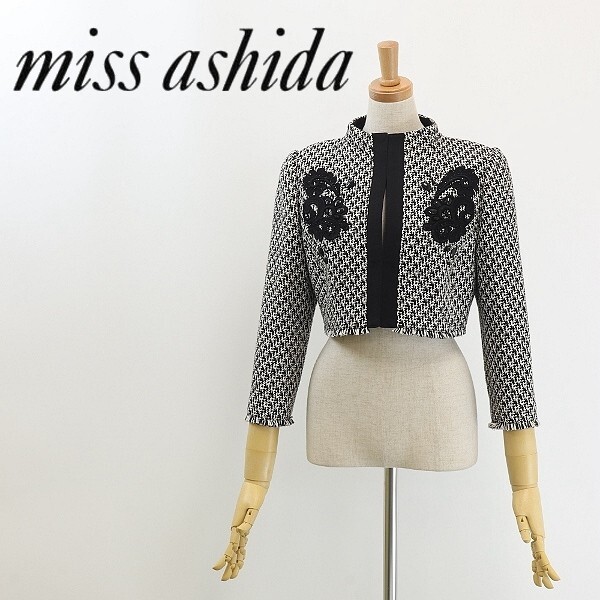 - 美品◆miss ashida ミスアシダ ビジュー&ビーズ装飾 ツイード フリンジ ショート丈 ジャケット ブラック×ホワイト 7