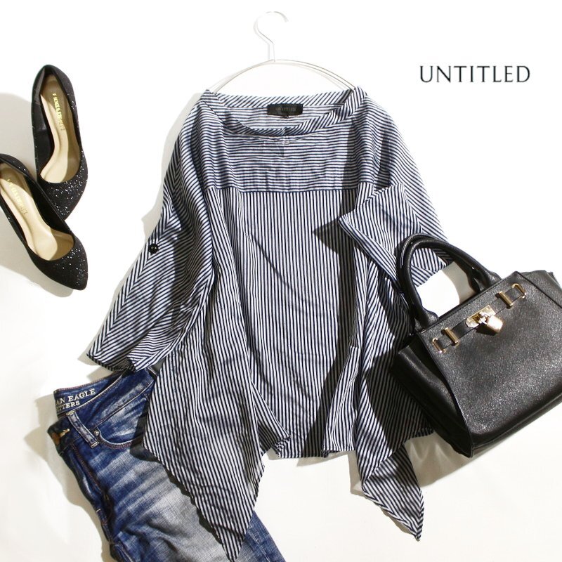 > 美品 アンタイトル UNTITLED 株) ワールド 春 夏 オーガンジー 艶 2way 七分袖 ~ 半袖 シャツ 生地 カットソー ブラウス 9号 2 ネイビー