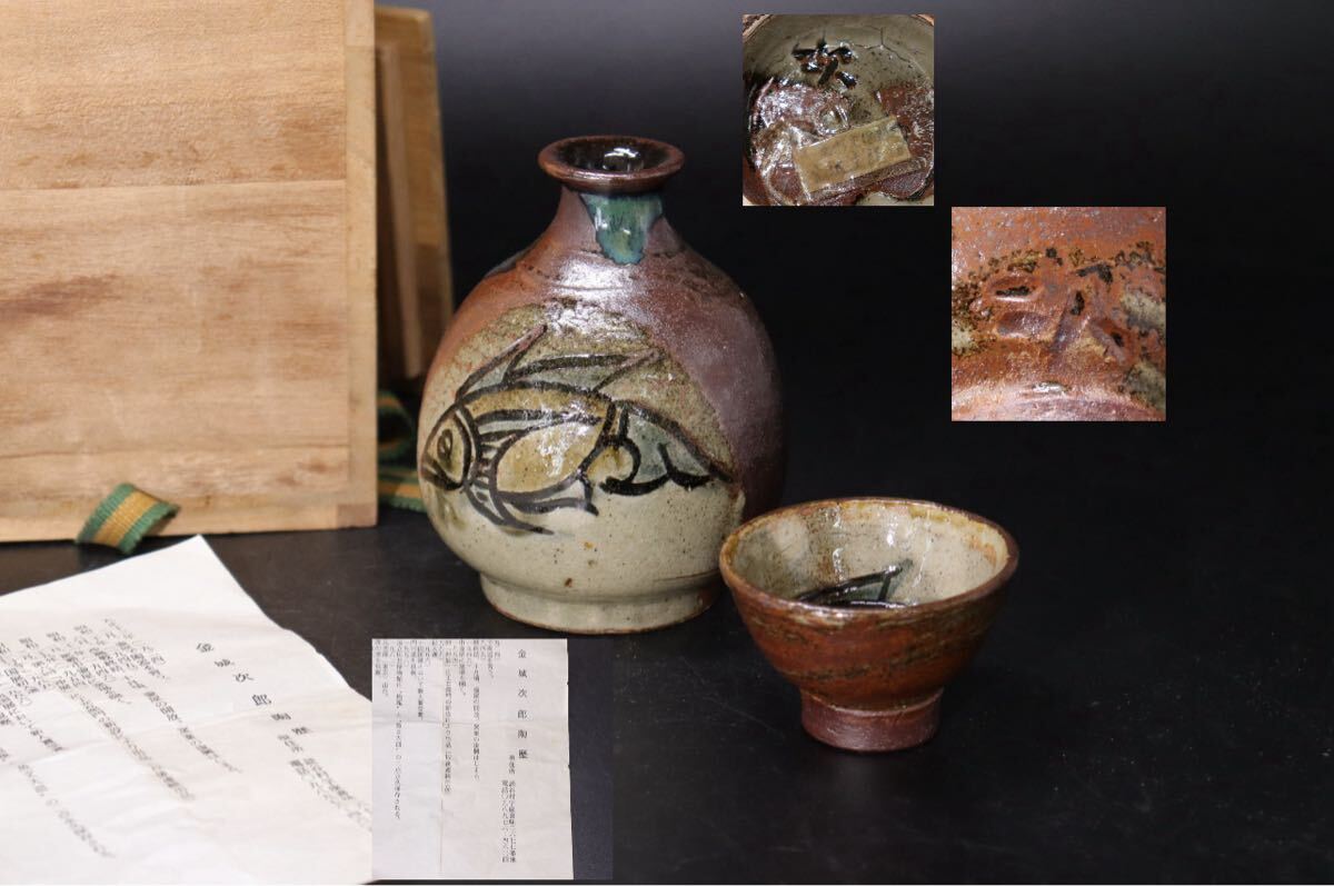 > 金城次郎 作 魚文 徳利 ・ 盃 揃 箱付 / 壺屋焼 琉球焼 沖縄 人間国宝 酒器 酒盃 煎茶道具 .B274