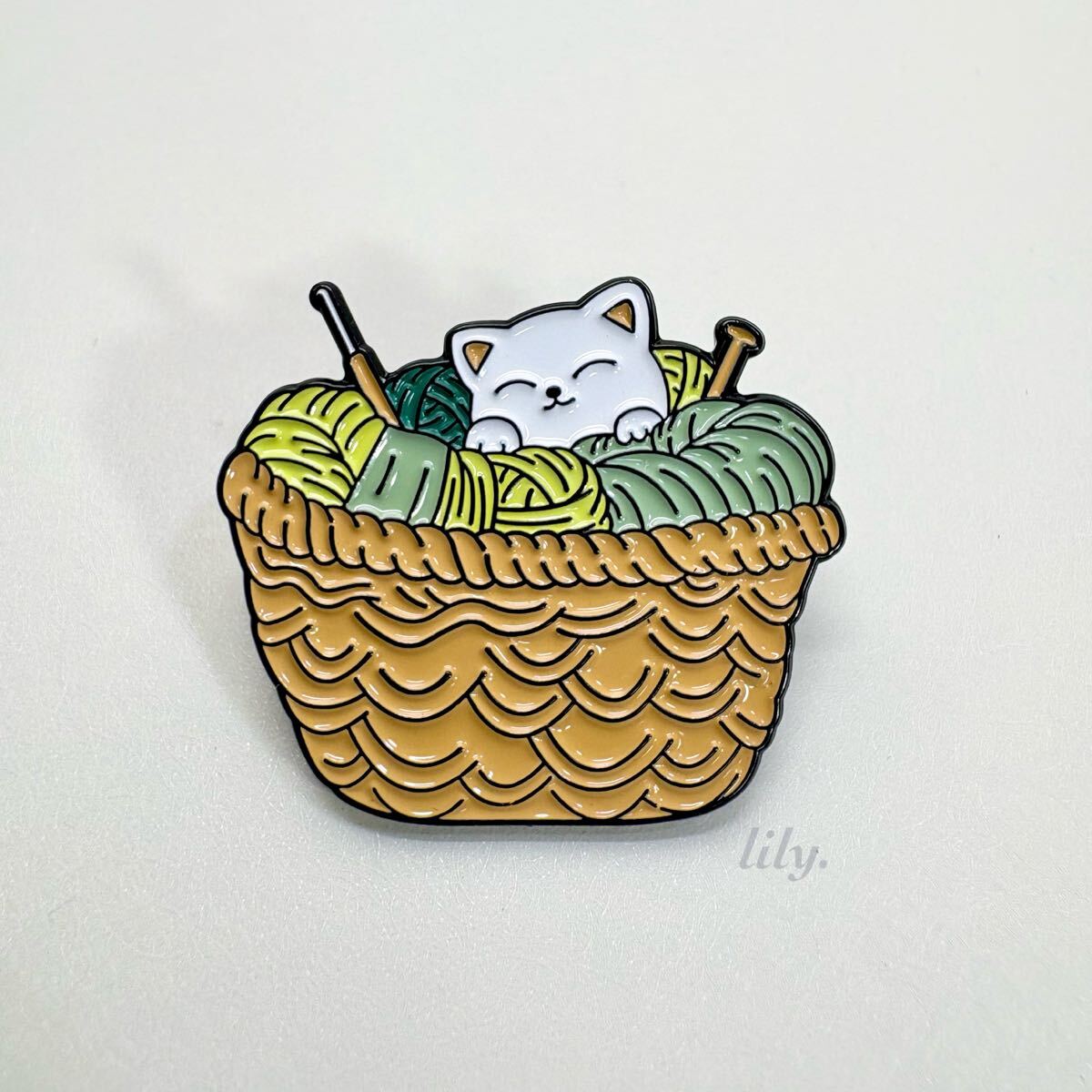 - 【ピンバッジ】編み物かごの中で眠る白猫さん 毛糸 かわいい 癒し