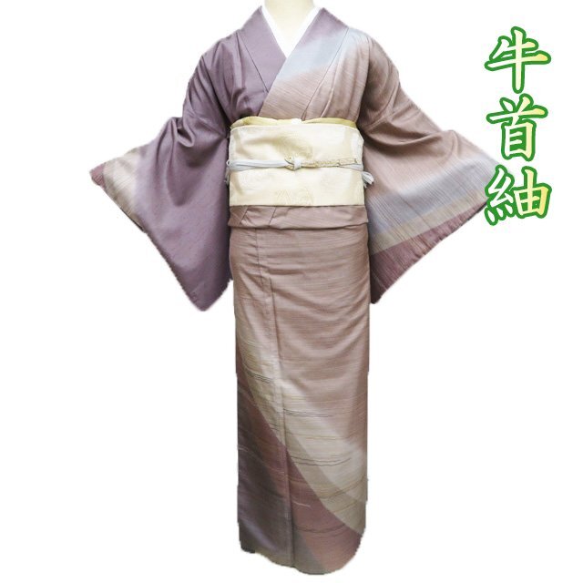 > 特選 牛首紬 着物 中古 正絹 袷 白山工房 ラベル付き 胡桃染色 薄茶色 多色 身丈170cm 裄66cm L トール ワイド きもの北條 A1201-7
