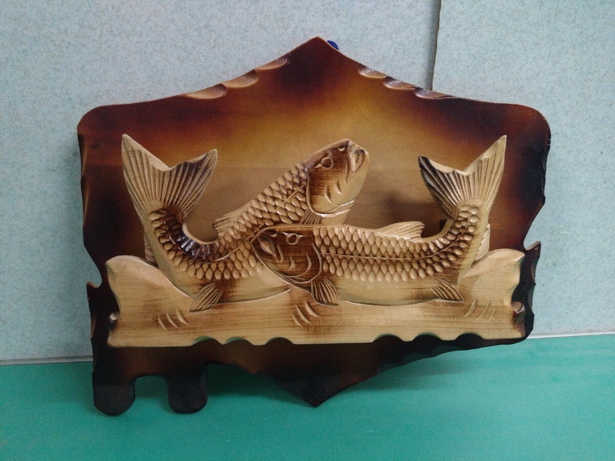 - ● 希少 北海道 旭川 サケ 鮭 サーモン 雄 雌 木彫り 壁掛け レターケース 手紙 ホルダー アイヌ 郷土 民芸 伝統 工芸 手彫り 彫刻 中古③