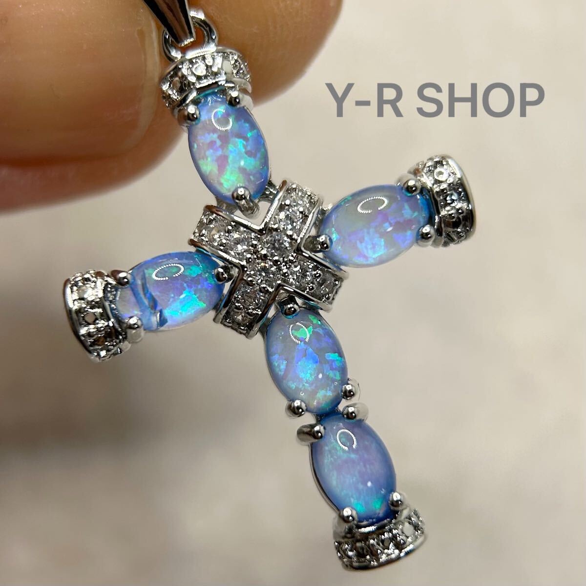 - ブルーファイヤーオパールとキュービックジルコニアのクロスデザインペンダントトップ★レディースネックレスシルバー925刻印新品宝石Y-R