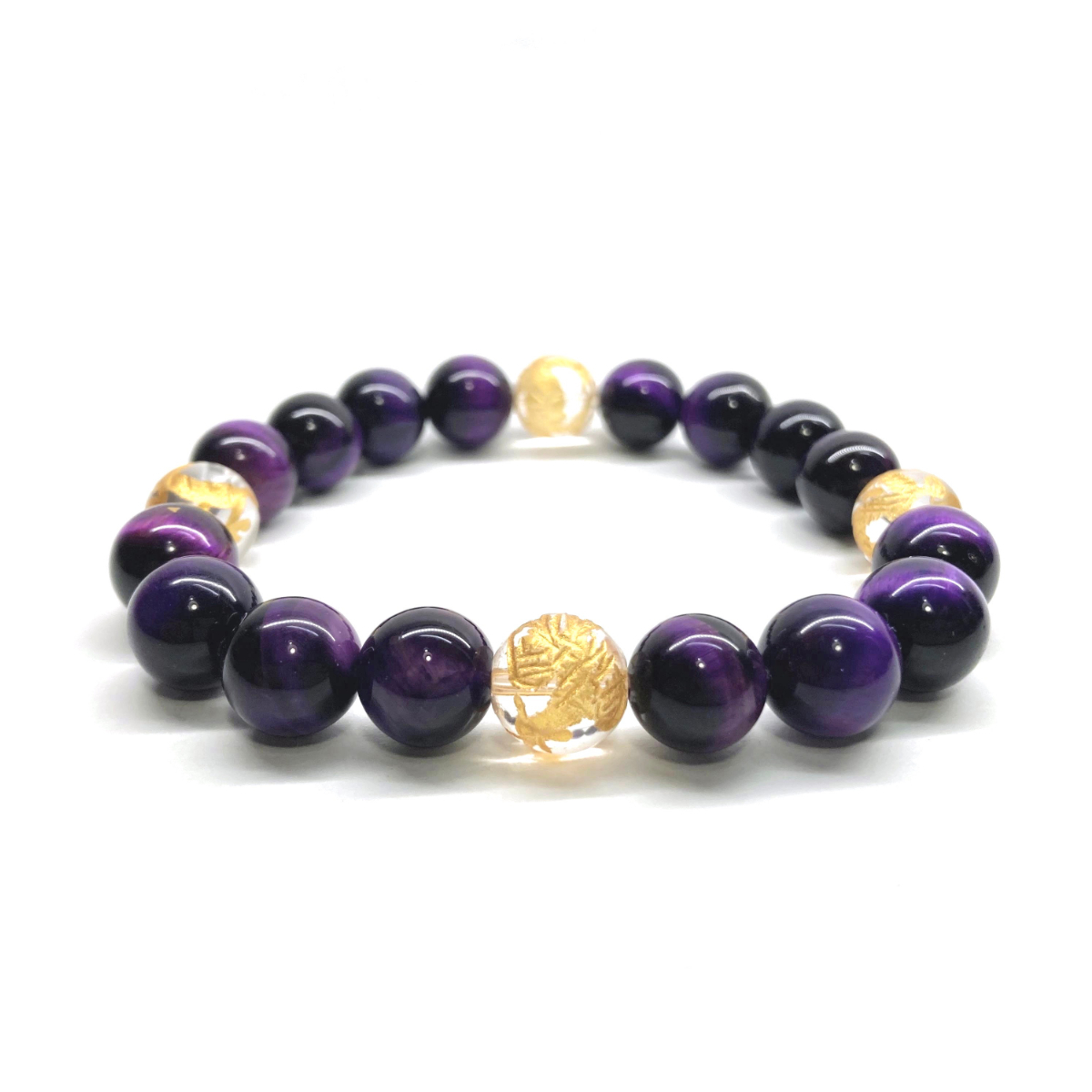 - 10mm 四神獣金彫水晶×パープルタイガーアイ パワーストーン ブレスレット天然石 運気上昇 開運 金運 青龍 白虎 玄武 朱雀 ☆