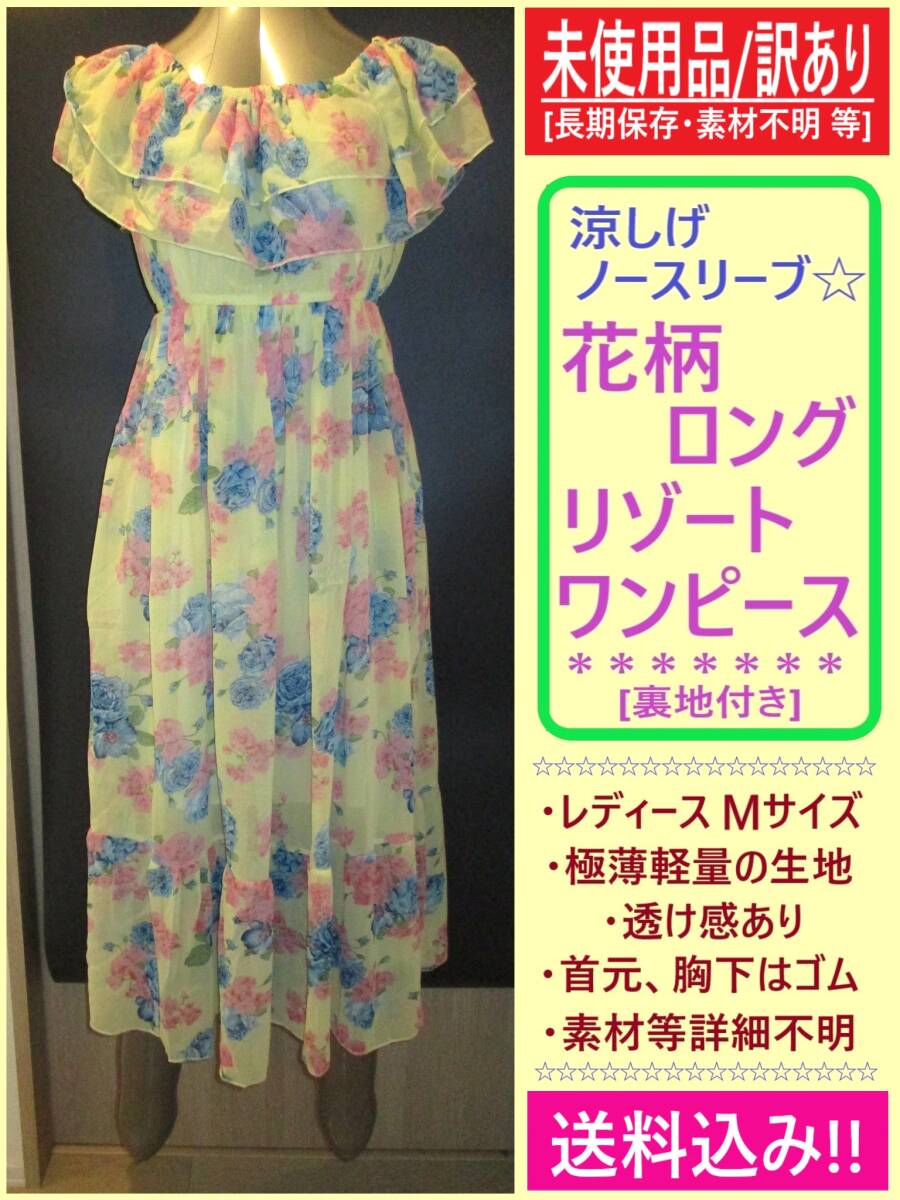 - 訳あり 未使用 レディース 花柄 マキシ丈 リゾート ワンピース Mサイズ イエロー 黄色 長期保存 フレアー 裏地付き ノースリーブ 夏 海外製
