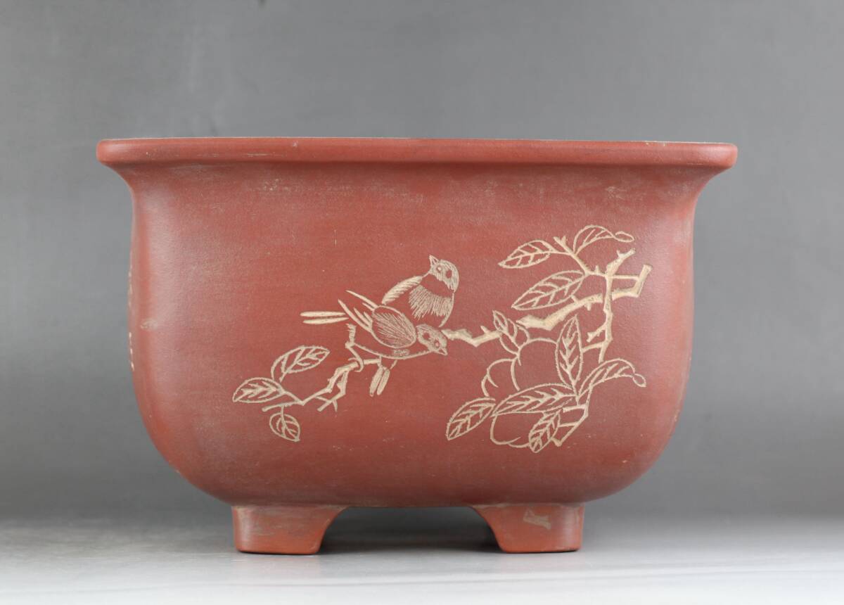 - 中国美術 中国古盆器 紫砂 朱泥 竹花鳥漢詩文 正方鉢 花器 盆栽鉢・珍品旧蔵・古賞物・時代物