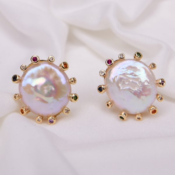 > GG 養殖ホワイトコインケシパールスタッドピアス、14×18mm、残り時間4日までに入札し,その後落札した方にブレスレット贈呈、KM宝石_ Apd