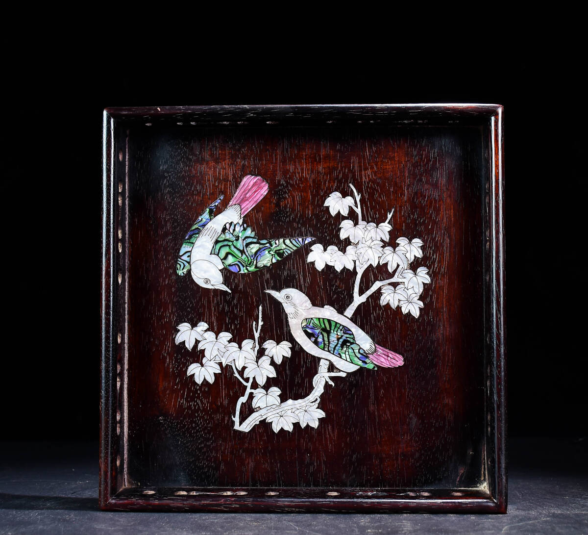 - 唐物 清 紫檀木 はめ込む貝 花鳥圖 茶盤 盤子 木製 古美術品 時代物 中国古玩 骨董品 D66