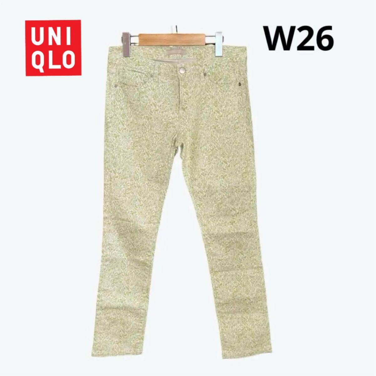 - ユニクロ UNIQLO デニムパンツ 綿 ジーンズ ポリエステル 花柄 ボタニカル柄 レディース Lサイズ ホワイト グリーン w26