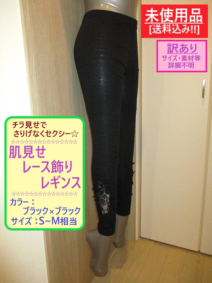 - 訳あり 未使用 レディース 肌 見せ レース 飾り レギンス 黒 × 黒 S~M相当? C 詳細不明 ブラック ロング ウエスト ゴム スパッツ 海外製