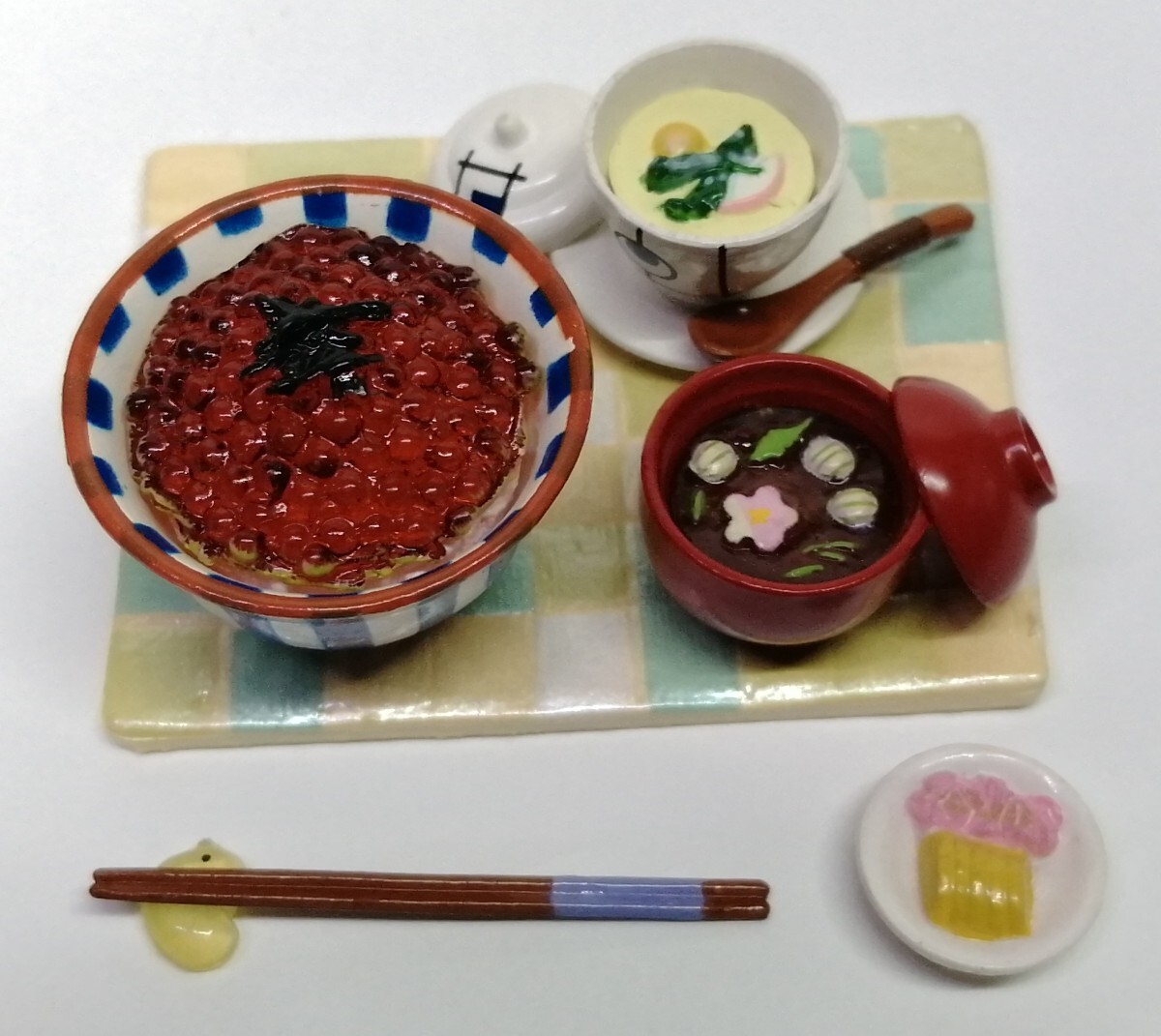 - いくら丼 ぷちサンプル 和食日和 吸い物 茶碗蒸し 皿 漬物 箸 箸置き スプーン マット ミニチュア フィギュア リーメント