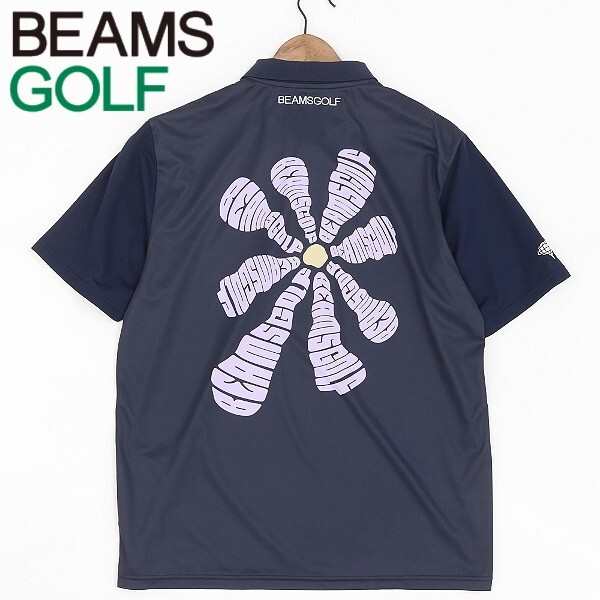 > 美品◆BEAMS GOLF ORANGE LABEL ビームス ゴルフ バック フラワープリント ロゴ刺繍 異素材 切替 ポロシャツ 紺 ネイビー L