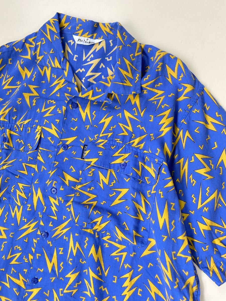 > ★ ヴィンテージ 稲妻柄 アロハシャツ ブルーサイズ4 (L~LL相当) ◆ レーヨン混 オープンカラー PIA SPORTS ピアスポーツ ◆W25 VKあY1-03