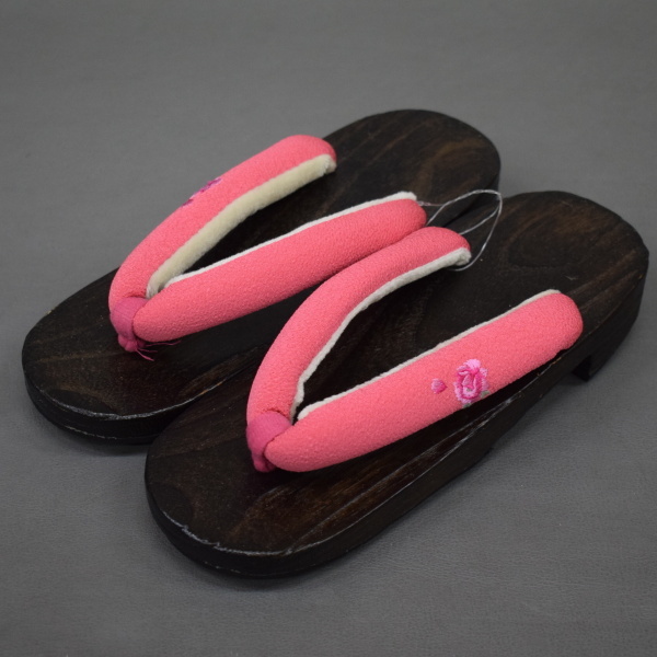 - A05-23【凛々】即決 新古品 桐台 浴衣 下駄 ピンク 刺繍 バラ