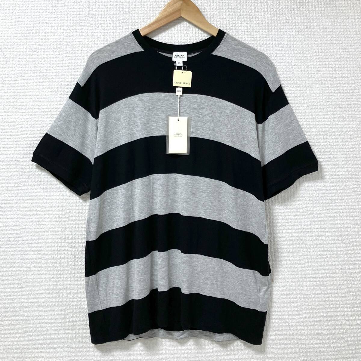 - 新品未使用品 ARMANI COLLEZIONI ボーダー レーヨン 半袖 カットソー Tシャツ 黒グレー メンズ XLサイズ アルマーニコレツォーニ 5060199