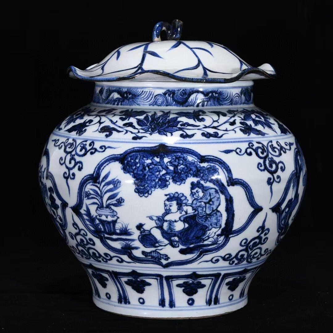 - 磁器 秘藏 元代 青と白の四愛・人物物語・ハスの葉の蓋缶 酒器 茶器 唐磁 染付 陶磁器 收蔵品 古美味 時代物 古置物 希少珍品 中國文玩6.10