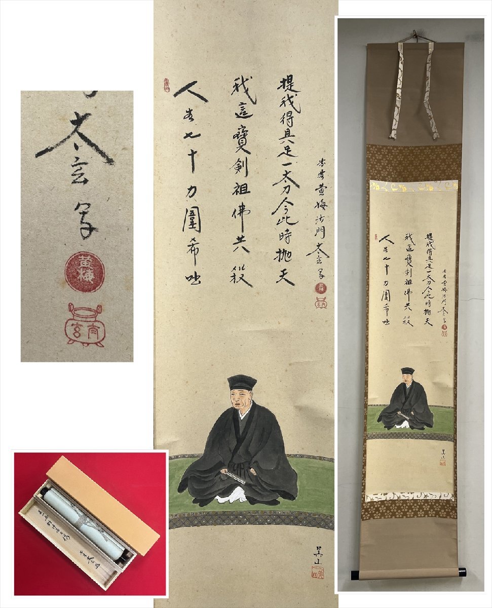 - 【千寿】大徳寺派 黄梅院 小林太玄 利休居士坐像 美山画 紙本 d1535◆箱 在銘 季節掛 茶掛 掛軸 掛物 茶道具 100039402